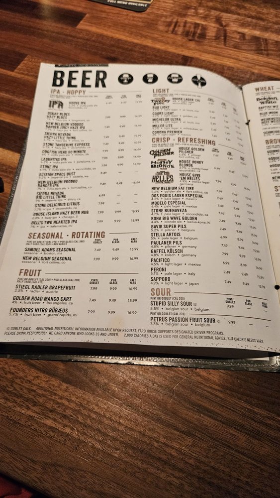 Available in pint or goblet (cal 270) pub glass (cal 390) half yard (cal 550) abv varies